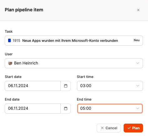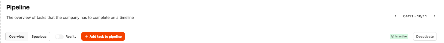 Add task to pipeline – Opens the planning dialog to add new tasks to the weekly schedule.