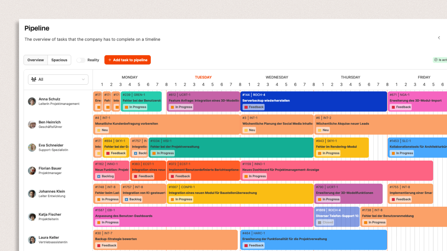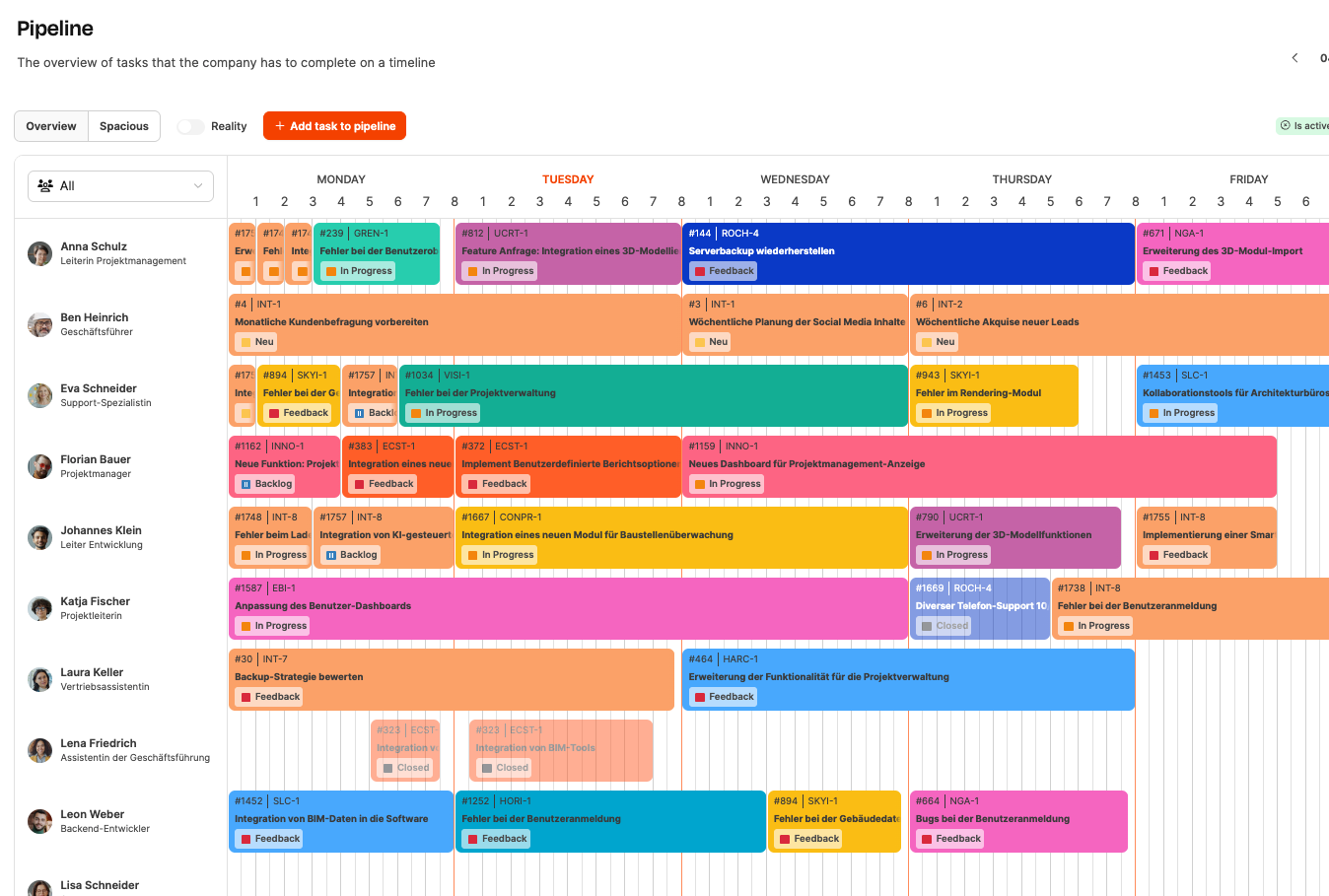 The pipeline view shows the team members in the vertical, and the calendar week in the horizontal. Each row stands for a person, and each colored card on the timeline means a planned task.