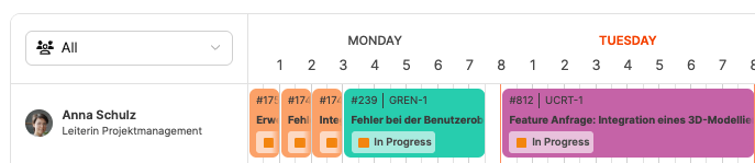 Shows each workday in 8-hour blocks. This compact view is great for quickly getting an overview of the planned tasks for all team members – perfect for status meetings or weekly capacity planning.