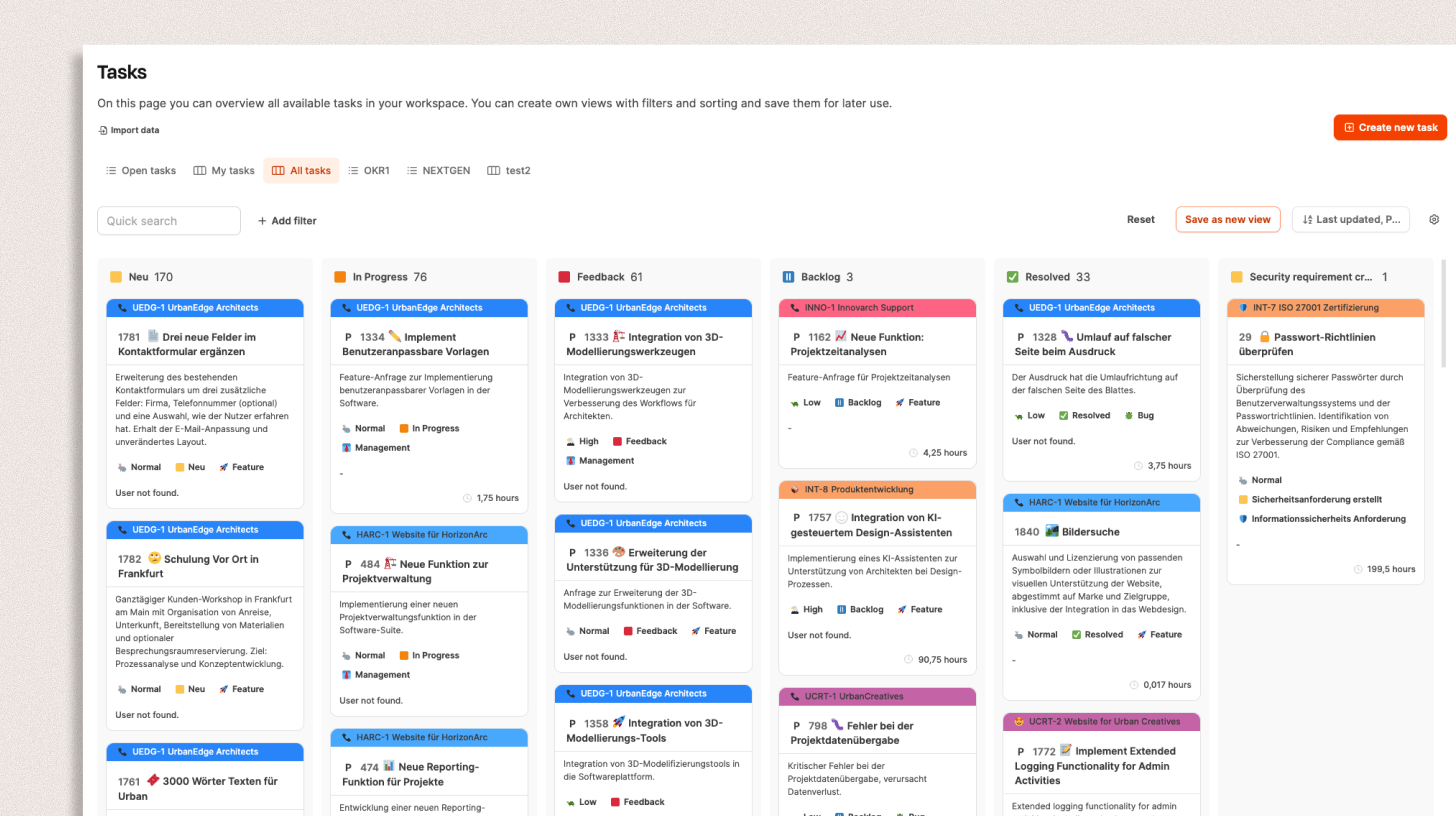 All workspaces—from client projects to internal processes—are based on tasks (tickets) that move smoothly through the whole workflow.