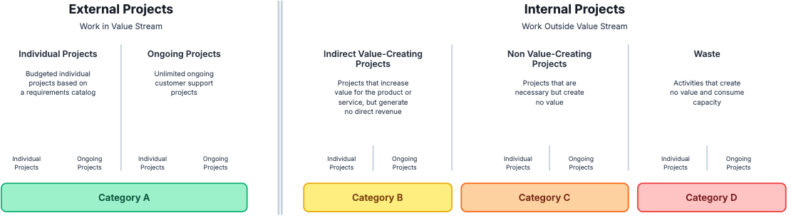B – Indirect value adding: Projects that increase the value of the product or service but don't generate revenue. Example: product development, quality management.