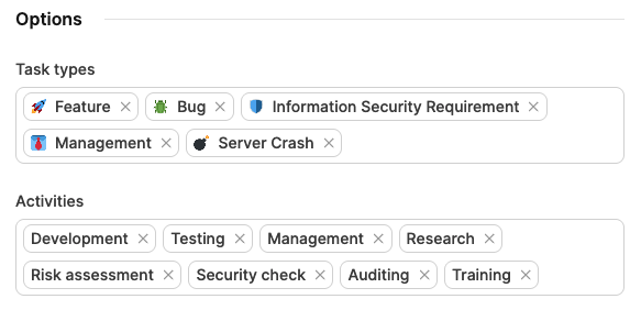 Examples: Feature, Bug, Management, Server issue, Information security requirement.