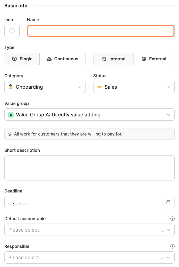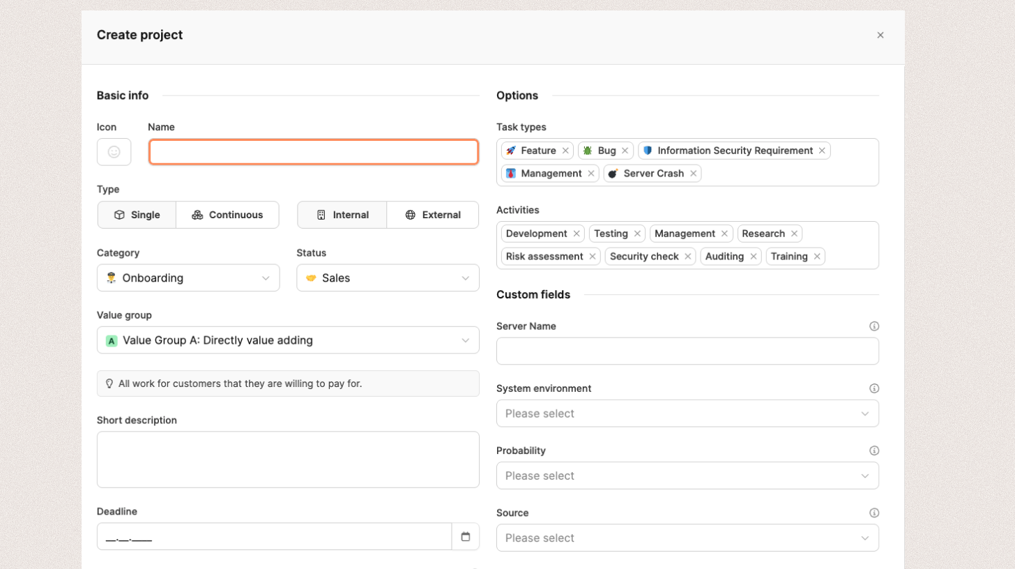 Category: Functional area or project type (e.g. Onboarding, Support, Implementation). Categories can be defined in the workspace settings.