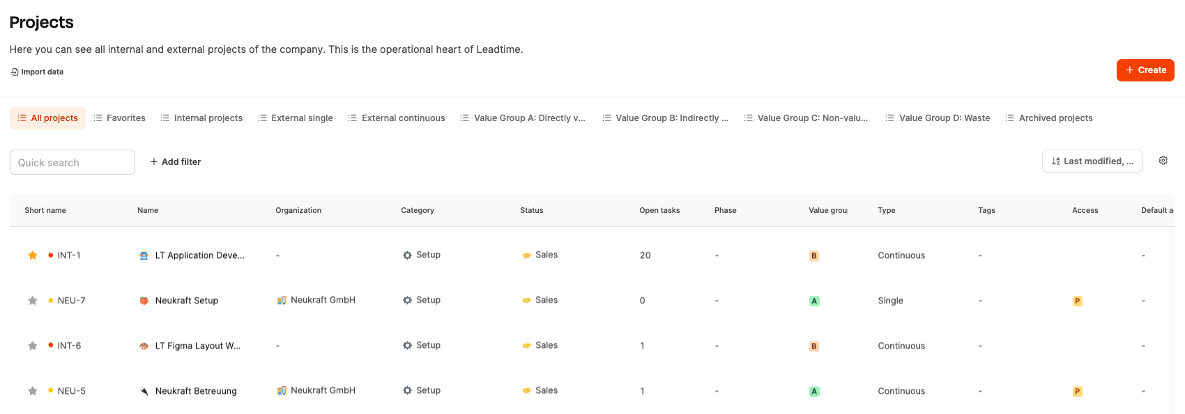 You can find the project list in the main menu under Projects. This overview helps you manage all your internal and external projects in one place. It lets you quickly filter, sort, prioritize, and open individual projects. The list is the starting point for portfolio management, tracking project status, and setting priorities.