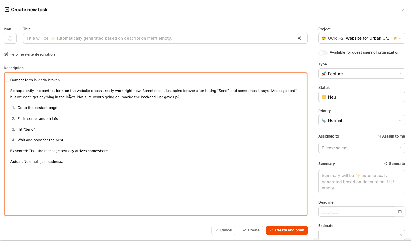 It helps especially when creating clear, professional, and consistent task descriptions – like when writing bug reports, feature requests, or internal work instructions.