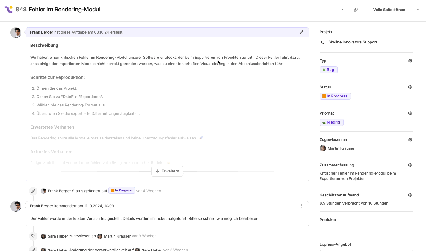 The comment is only visible to internal employees. This is good for follow-up questions, votes or technical discussions that the customer shouldn't see.