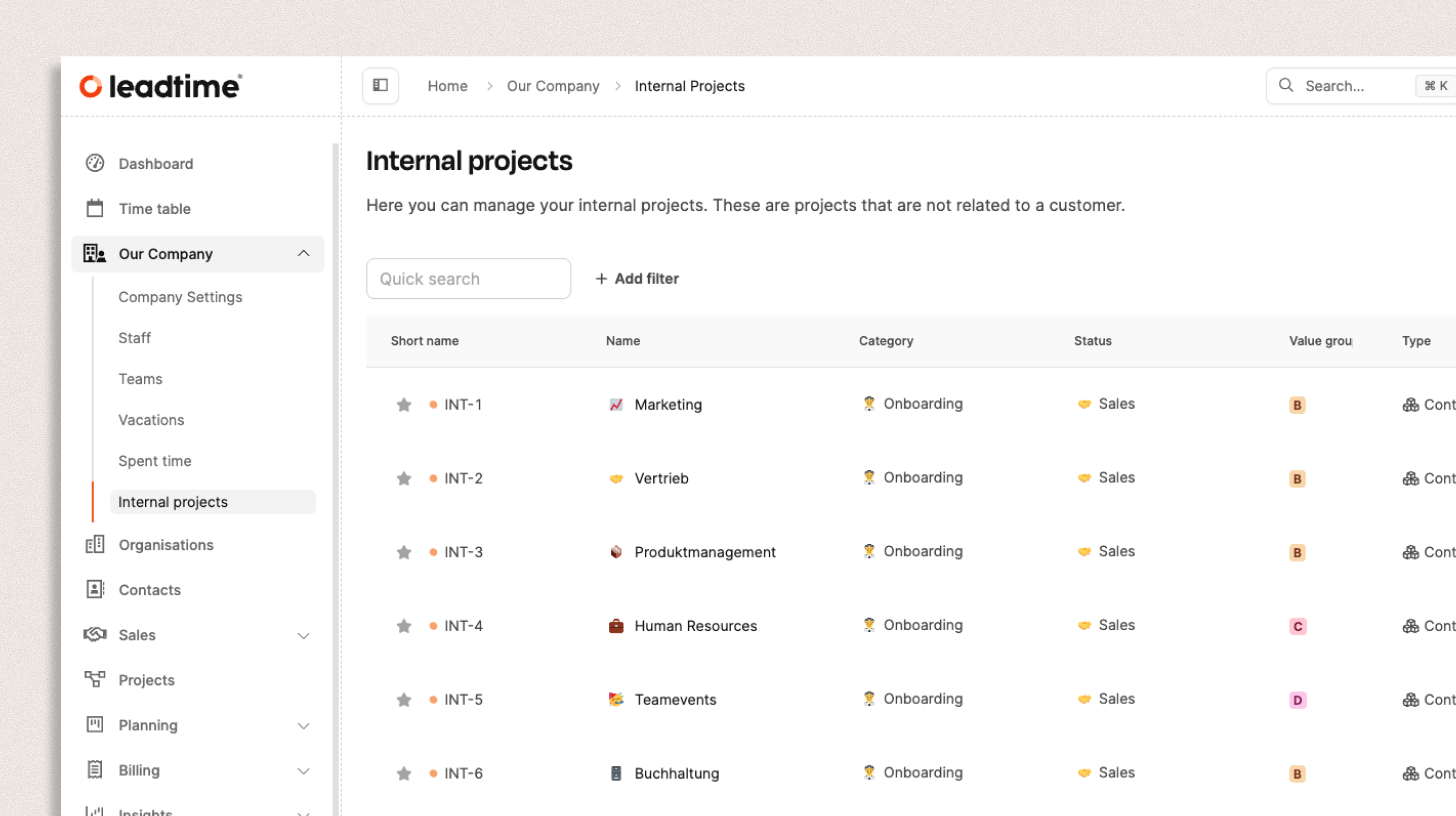 In Leadtime, every kind of work is tracked as a project — no matter if it’s for customers or for internal purposes. This setup makes it easy to plan, track, and analyze everything going on in your company. Leadtime always makes a clear distinction between external and internal projects.