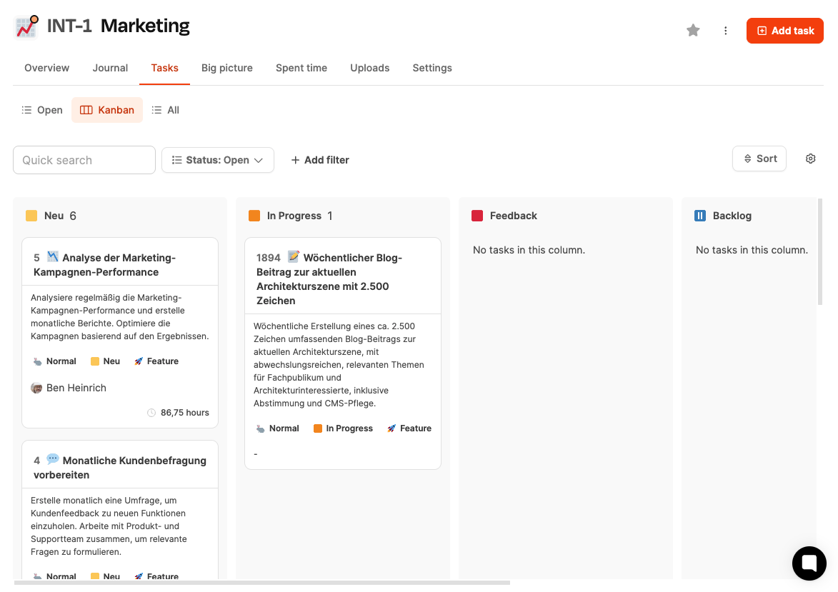 This structure makes sure that internal working hours can be tracked precisely and operational tasks stay separated from strategic projects.