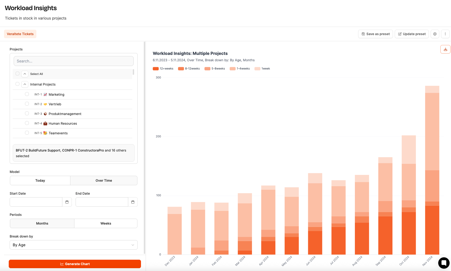 With Workload Insights you can analyze how the number of open tickets are changing in your projects – either right now or over longer periods. The goal is to make workloads transparent, spot trends early, and avoid overloads. This view is especially helpful for support and project teams to identify bottlenecks and manage the processing of open tasks more efficiently.